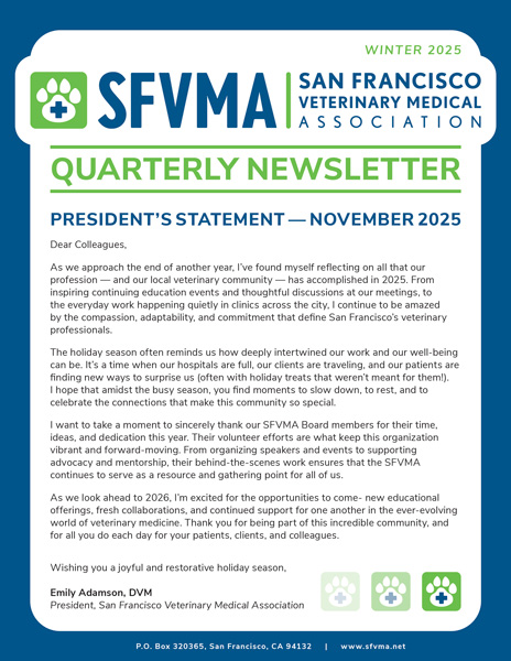 As we approach the end of another year, I’ve found myself reflecting on all that our profession — and our local veterinary community — has accomplished in 2025. From inspiring continuing education events and thoughtful discussions at our meetings, to the everyday work happening quietly in clinics across the city, I continue to be amazed by the compassion, adaptability, and commitment that define San Francisco’s veterinary professionals.